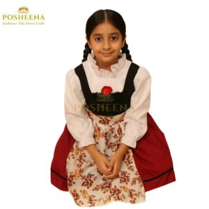 This Italian Cultural Dress For Girls features a classic blouse with ruffled neckline, a fitted black bodice with lace-up detail, a floral apron, and a maroon skirt. The outfit captures the charm of Italian folk attire, making it the perfect choice for cultural exhibitions and celebrations. Its vibrant design ensures girls stand out in any gathering.