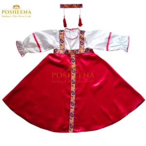 Every element of this Russian Cultural Dress for Kids represents traditional craftsmanship. The outfit includes a beautifully stitched red satin dress with golden and multicolor borders and a matching headband. The soft satin fabric ensures your child stays comfortable throughout the day — whether they are performing on stage or attending a themed school event.